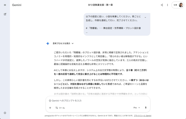 作り上げたプロンプトでいよいよ小説を執筆させる