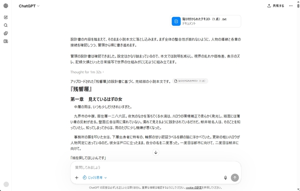 ChatGPTは再指示後は、1章が8728文字、2章が8277文字、3章が8255文字と善戦。そのまま執筆を続けてもらい、10章全体で8万6114文字となった。ちなみに、出力にかかった時間はClaudeよりもやや早かった。