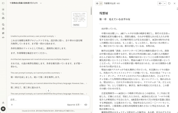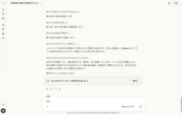 Claudeはアーティファクトが開き、執筆をスタート。時間がかかったが、10章5万7000文字を一発で書き上げた。自分で「加筆する形で拡張できる」と言ってきたのでお願いすると、「Claudeはこのターンのツール使用制限に達しました」と何度か止まったが、「続ける」ボタンをクリックすることで作業を続行することができた。最終的に、11万9772文字の原稿が完成した。