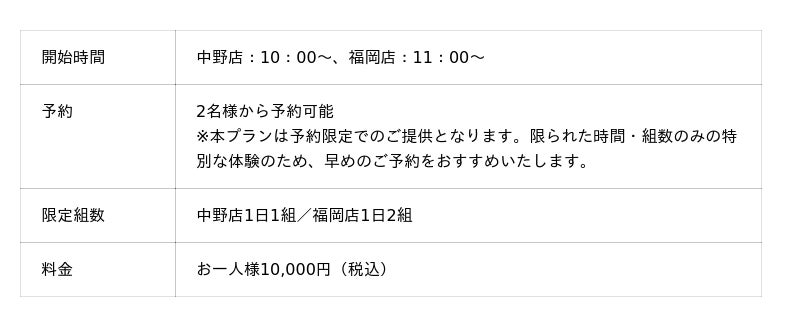 本プランは予約限定での提供となり、中野店では1日1組、福岡店では1日2組限定でのご案内となり、2名様からご利用可能です。料金はお一人様10,000円(税込)となっております。