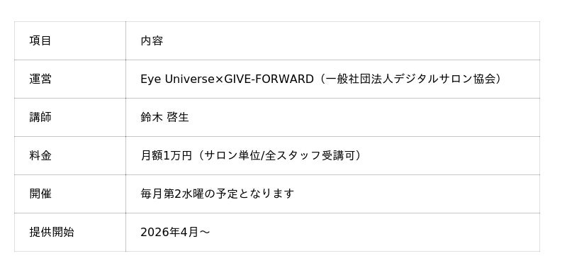 株式会社Eyeuniverseが運営する一般社団法人デジタルサロン協会(所在地:東京都千代田区、以下「当社」)は、美容業界を対象とした定期型AI研修プログラム「デジサロDX」の提供を2026年4月より開始します。本プログラムは、株式会社Eye Universeと株式会社GIVE-FORWARDの業務提携のもと共同推進するもので、美容業界全体のAI・DXリテラシー標準化と業務効率化を目的としています。