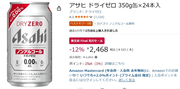 現在開催中のAmazon新生活 Final先行セールで、「アサヒ ドライゼロ 350ml缶×24本入」は割引価格で販売されています。