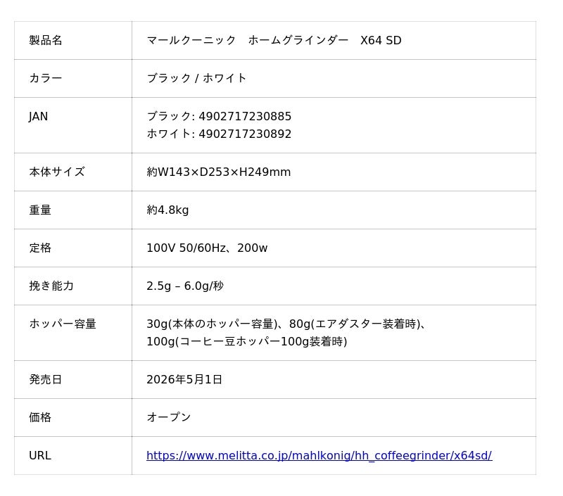 ペーパードリップシステムを世界で初めて考案したドイツのコーヒー専業ブランド メリタの日本法人メリタジャパン株式会社(本社:東京都江東区、代表取締役社長:服部雅能、www.Melitta.co.jp、以下「メリタ」)は、2026年5月1日、業務用コーヒーグラインダーのリーディングブランド・Mahlkonig(マールクーニック)の家庭用コーヒーグラインダー「X64 SD」を発売いたします。