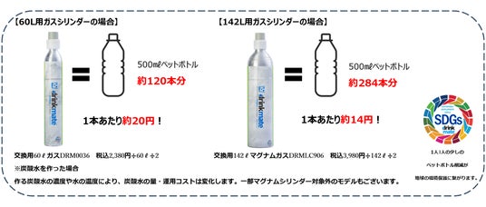 交換用142Lマグナムガスシリンダーを使用した場合、500mlあたり約14円で炭酸水が作れます。