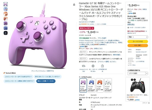 Amazon.co.jpにて、GameSirのXbox用有線コントローラー「GameSir G7 SE(パープル)」が販売中だ。過去価格は6499円だが、「新生活 Final 先行セール」により10%オフの5849円で購入できる(4月1日時点)。