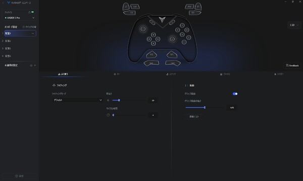 これら多数のボタンのキー割当をはじめ、様々なカスタマイズを可能にしてくれるのが専用アプリ「FLYDIGI PC SPACE 4.0」。バイブレーションの強度、スティック感度、ジャイロ、トリガーのストロークの調整など、これでもかというほど設定項目が多い。