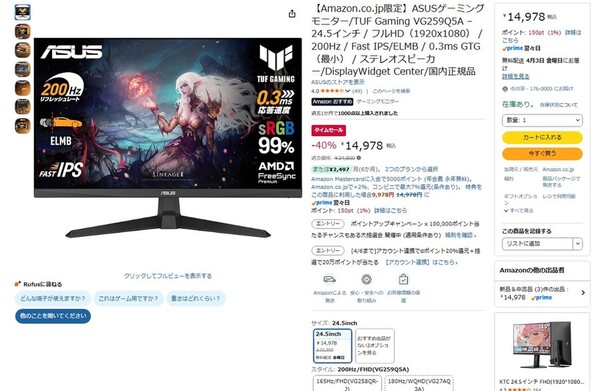 180Hz×1msの高速描画を約1.8万円で。ASUS製24.5型フルHDゲーミングディスプレーがタイムセール! -