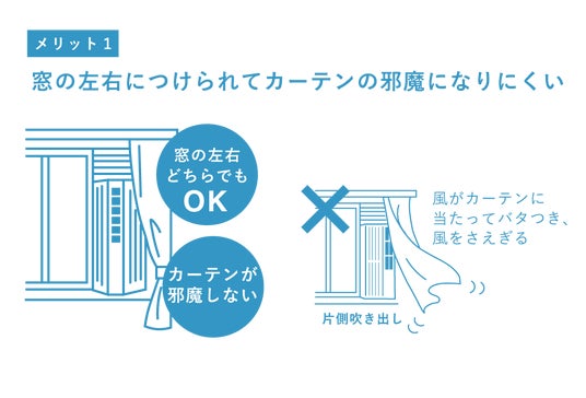 従来の片側吹き出しタイプでは、冷風がカーテンに当たってバタつきや風遮りが起こりがちでしたが、センター吹き出しならカーテンに干渉せずスムーズに風を届けます。さらに、左右どちらの窓枠にも取り付けられるため、設置場所を選ばずレイアウトの自由度が高まります。さらにセンター吹き出しは、本体中央から風を送り出すため左右へ均等に広がり、室内の空気をムラなく循環させます。