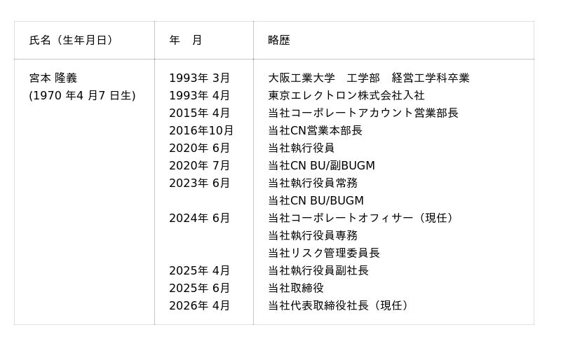 東京エレクトロン デバイス株式会社(本社:東京都渋谷区、以下「当社」)は、2026年4月1日付で代表取締役社長が交代したことをお知らせいたします。新社長には宮本 隆義が就任し、同日付で前社長の徳重 敦之は代表取締役会長・CEOに就任いたしました。