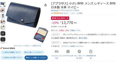 abrAsusの「小さい財布」がAmazon新生活 Final 先行セール対象。過去価格16,200円のところ、15%オフの13,770円で販売中。