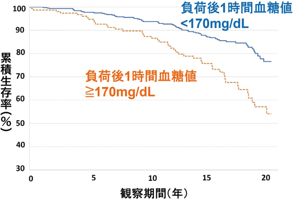 そこで片桐さんらは、岩手県大迫町(現・花巻市)の一般住民を対象に1986年から継続的に実施されている追跡調査のデータを用いて、長期的な検討を実施した。この追跡調査は高血圧や循環器疾患に関するもので、4 年に1回の頻度でブドウ糖負荷試験が実施されている。研究では、耐糖能が正常である平均62歳の地域住民を対象に、ブドウ糖負荷試験における血糖値と寿命の関係を検討。その結果、ブドウ糖摂取1時間後の血糖値が1デシリットルあたり170ミリグラム(mg/dL)以上の群では、それ以下の群に比べて、その後20年間で顕著に死亡率が高いことがわかった(図4)。さらにその死因としては、動脈硬化や悪性腫瘍が増えることも示された。