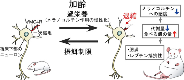 MC4Rは神経細胞全体にあるのではなく、神経細胞からアンテナのように伸びている「一次繊毛」の表面にしか存在しない。そこで、名古屋大学大学院医学系研究科の中村和弘教授らは、ラットのMC4Rがある一次繊毛は加齢によって徐々に短くなること、遺伝子改変によって一次繊毛を強制的に短くするとエサの摂取量が増えて体重も体脂肪率も増加することを突き止めた(図5)。現在は、薬の投与によって一次繊毛を伸ばせないか、研究を進めているという。