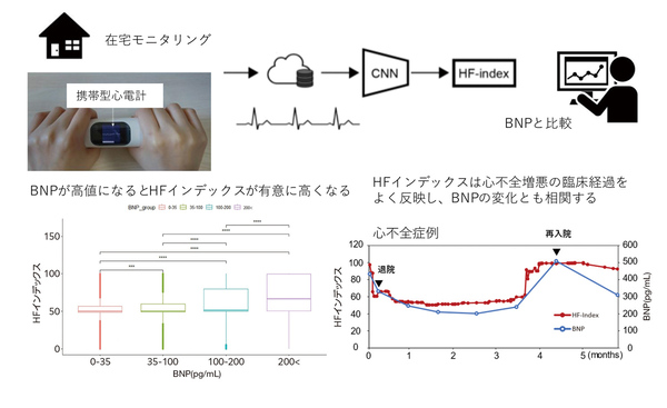 臨床の場では心不全の指標として、血液検査により「脳性(B型)ナトリウム利尿ペプチド(BNP)」を測定することが一般的だが、HFインデックスはBNPと同等あるいはより鋭敏に心不全を検出できることを明らかにした(図1)。このシステムを応用することで、自宅で心不全を早期に発見でき、遠隔医療の発展にもつながることが期待される。