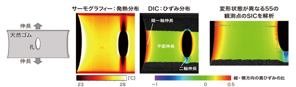 具体的には、長さ175ミリメートル、幅20ミリメートルの幅広の天然ゴムシートに直径5ミリメートルの孔を開け、幅の方向に引っ張る。その際、画像解析によってひずみ分布を、サーモグラフィーによって発熱分布を同時に調べる。ひずみ分布解析からは各位置でどのような変形が起きているのかを読み取ることができる。すなわち、ある点では一方向の伸長、別の点ではある割合の二方向変形が生じていることがわかる。ゴムは結晶化する際に大きく発熱するため、発熱分布は結晶化の度合いを示す指標となる。