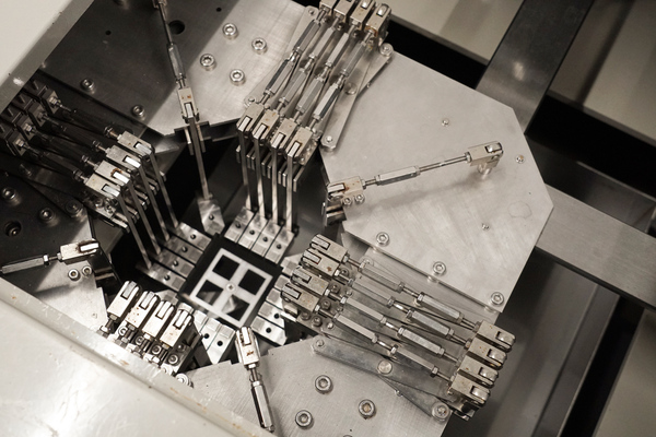 浦山さんの研究室では、縦軸と横軸の二方向に素材を独立して引き伸ばす二軸伸長測定装置を自作し、一方向の測定では得られない多様な力学データを取得できる体制も整えている(図4)。現実のゴム製品は複雑な形状をしており、多方向から引っ張ったり押し込んだりして複雑な変形を受けるからだ。