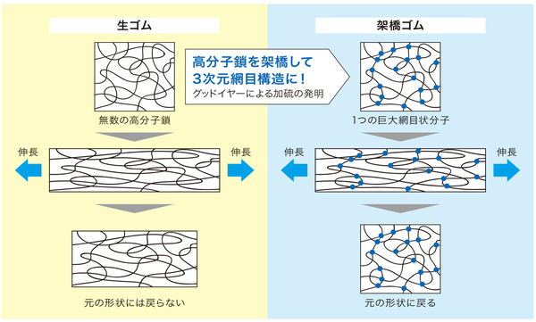 弾力はあるものの、本質的には液体に近い状態である生ゴムは、大きく伸ばすと元の形に戻らない。だが、グッドイヤーが発明した加硫によって、高分子鎖同士が部分的に結びつき、3次元の網目構造が形成される。この「架橋」によって、伸ばしても元の形に戻る回復性を持つ「固体」としての性質が加わる(図1)。こうした「液体」と「固体」の二面性を利用して耐久性や弾力性を実現しているのが、現在のゴム製品だ。
