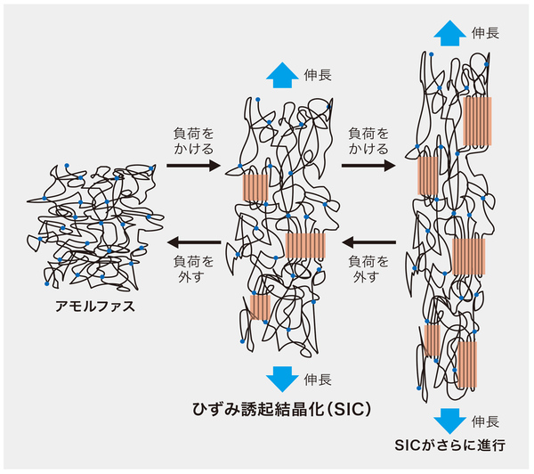 ゴムを伸ばした時に結晶化する現象は「ひずみ誘起結晶化(Strain Induced Crystallization(ストレイン・インデュースト・クリスタリゼーション):SIC)」と呼ばれ、1925年に発見された。SICによってゴム自体がさらに硬くなる自己補強効果がもたらされ、ちぎれてバラバラになる破断現象が起こりにくくなる。ゴム製品の持つ強靱性は、SICによる自己補強効果で実現しているのだ。