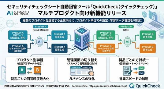 セキュリティチェックシート自動回答ツール「QuickCheck(クイックチェック)」を運営する株式会社AIセキュリティソリューションズ(本社:東京都渋谷区、代表取締役:門脇 史恭)は、複数のプロダクトを運営する企業向けに、プロダクト単位で設定やAI学習データを個別に変更・管理できる新機能をリリースいたしました。これにより、製品ごとに異なるセキュリティ仕様や回答方針を正確に反映し、さらなる回答業務の高速化と品質向上を実現します。