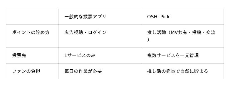 また、投票先は複数のアプリ・サイトに分散しており、「今週はどのアプリでどんな投票がある?」「締め切りはいつ?」と確認するだけでも時間がかかります。OSHI Pickは、散在する投票情報を一箇所に集約する「ハブアプリ」として、ファンの推し活をサポートします。