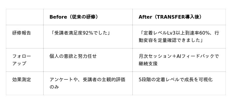 TRANSFERを導入すると、研修の「やった感」が「定量的な成果」に変わり、研修の効果を"感覚"ではなく"データ"で語れるようになります。