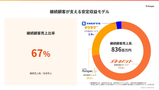 当社の事業モデルの特徴は、既存顧客からの継続売上が収益基盤を支えている点にあります。2025年度の継続顧客売上は836百万円(全体売上の約67%)に達しており、新規獲得に依存しない安定した収益構造を構築しています。