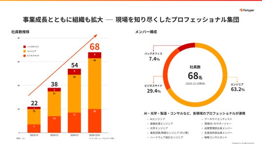 2025年12月時点で正社員68名が在籍(総人員95名、アルバイト・インターン含む)。エンジニア比率は63.2%であり、AIエンジニア・データサイエンティストに加え、製造業の品質管理・生産技術出身のメンバーが多数在籍しています。