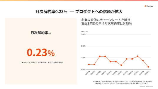 製造業向け外観検査&品質管理AI「メキキバイト」の月次解約率は0.23%(2025年度実績)。これは年換算で約2.8%に相当し、SaaSビジネスにおいて極めて低い水準です。