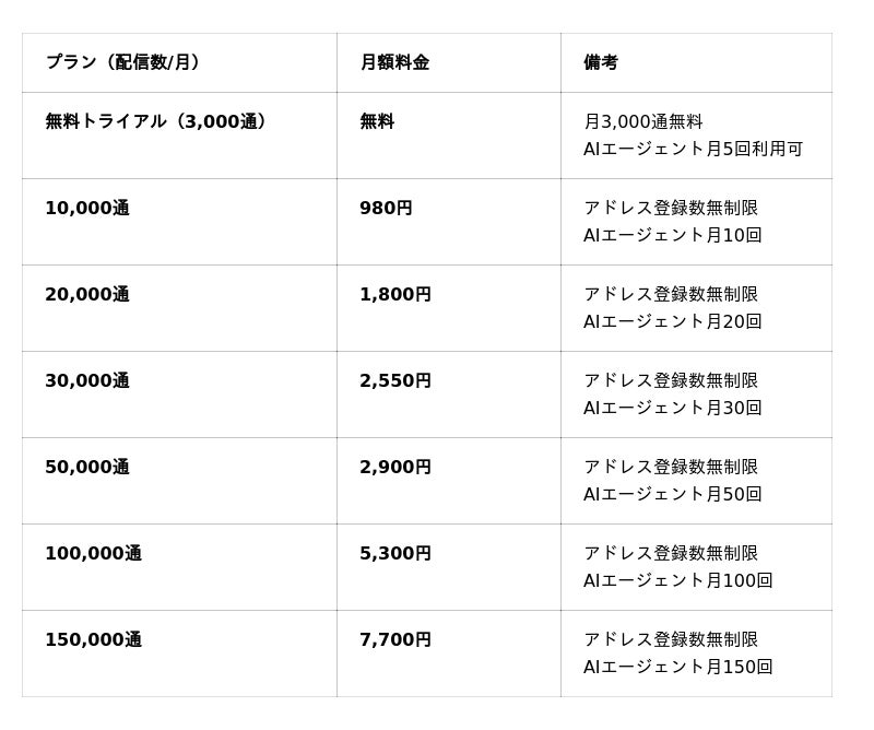 リストが増えても料金は増えません。配信数のみのシンプルな課金体系だから、個人事業主から大企業まで、規模に関わらず安心して使えます。面倒なアドレスクリーニングも一切不要。配信できないアドレスは自動で配信対象外になります。