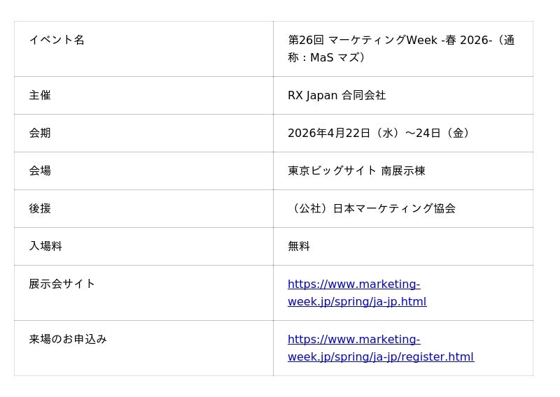 2026年4月22日(水)~24日(金)に東京ビッグサイトで開催される、国内最大規模のマーケ全領域展示会です。約300企業が一堂に会し、約20,000名のビジネスパーソンの来場が見込まれています。