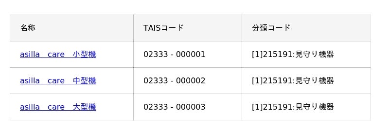 「asilla care」は、公益財団法人テクノエイド協会が運営する福祉用具情報システム(TAIS:Technical Aids Information System)に登録されており、TAISコードを取得しています。