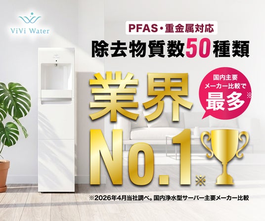 株式会社VISION(本社:愛知県名古屋市中区栄、代表取締役社長 鈴木浩司)は、「本当に安心して飲める水」をすべてのご家庭にお届けするため、当社の浄水型ウォーターサーバー「ViVi Water」において、有害物質40種類+細菌8種類+ウイルス2種類=合計50種類の除去を実現した新浄水カートリッジ「ハイグレードプラス」を、2026年4月1日(水)より全機種に標準搭載して提供開始いたします。