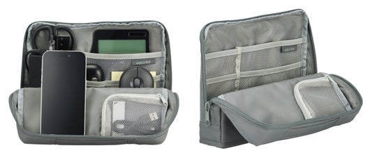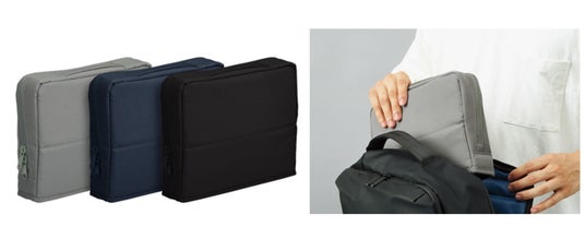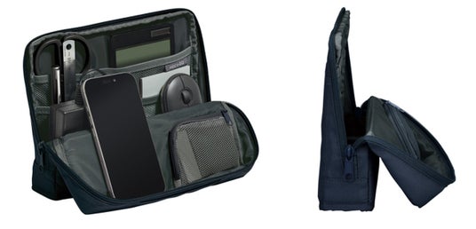 マウスやACアダプターなどの大きめのガジェット類を収容できるスペースと、ペンやイヤホンなどの文具や小物類を整理しやすい6つのポケットや仕切りを備えているため、より収容力がアップしました、また、ファスナーを開けるだけで開口部が前方に広がって自立する構造のため、必要なものをスピーディーに取り出すことができます。フリーアドレス環境で働くオフィスワーカーの仕事効率の向上をサポートします。