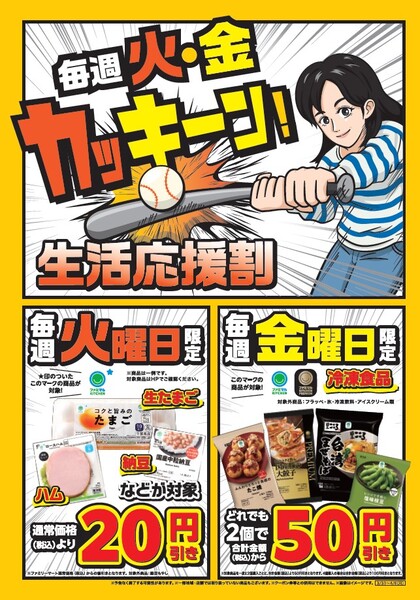 毎週火曜日:生たまご・ハム・納豆などの商品が20円引き!