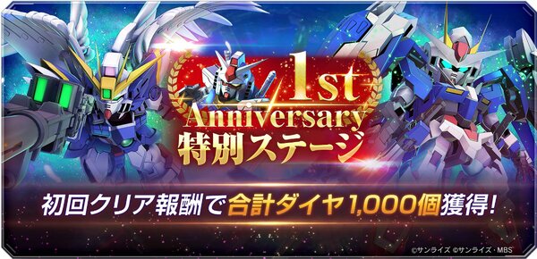 サービス開始から1周年を記念した「1stアニバーサリー特別ステージ」が開催中。「1stアニバーサリーピックアップガシャ」にて初登場した限定URユニット「ウイングガンダムゼロ(EW版)(EX)」と「ダブルオーライザー(最終決戦仕様)(EX)」をそれぞれお試しできる「1stアニバーサリー特別ステージ」を追加している。