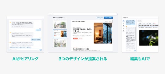 利用の際は本サービスの管理画面から起動し、事業内容・強み・サイトの目的といったAIからの質問に回答するだけでWebサイトの制作が行えます。ヒアリング内容に基づき、最適なデザインとコンテンツをAIが自動で生成します。