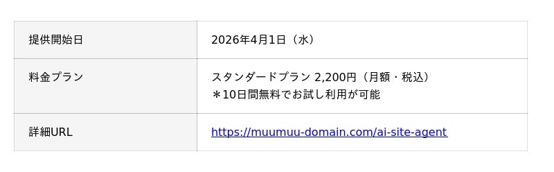 GMOインターネットグループのGMOペパボ株式会社(代表取締役社長:佐藤 健太郎 以下、GMOペパボ)が運営するドメイン取得サービス「ムームードメイン byGMOペパボ」(URL:https://muumuu-domain.com/)は、AIとの対話でWebサイトを自動生成できる新オプション『ムームーAIサイトエージェント』を、2026年4月1日(水)より提供開始します。