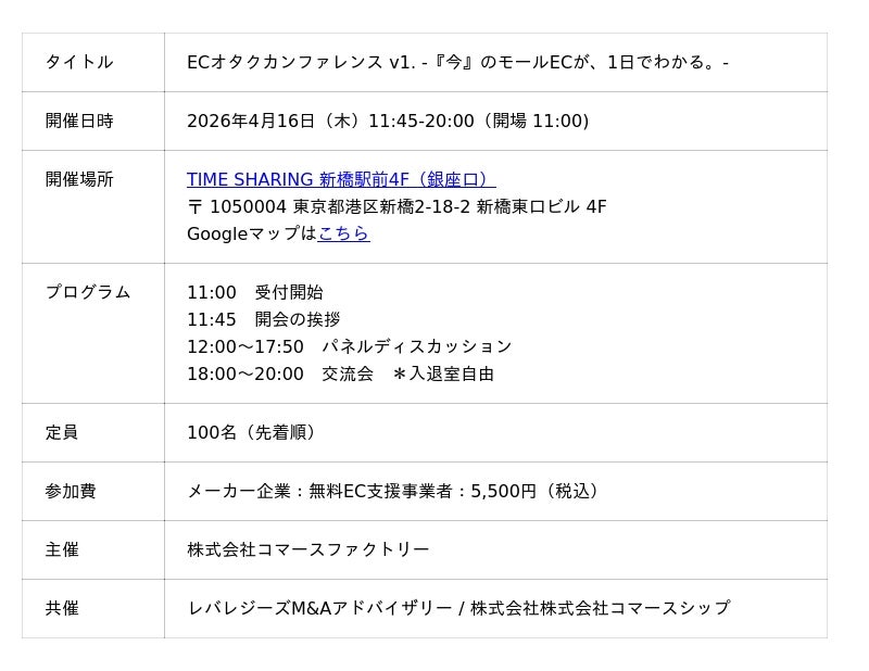 株式会社コマースシップ(代表取締役社長:上野護)は、2026年4月16日(木)に東京都内で開催される「ECオタクカンファレンス v1. -『今』のモールECが、1日でわかる。-」に共催として参加することをお知らせいたします。