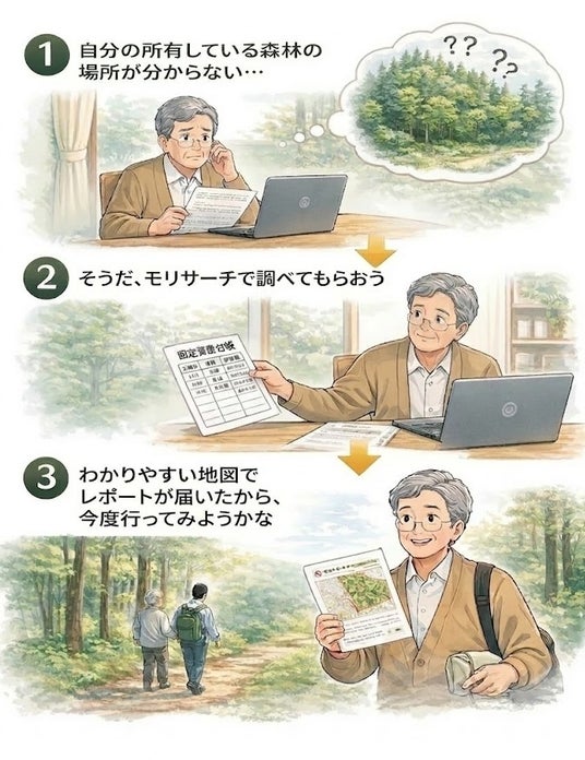 モリサーチは、固定資産課税台帳や登記情報などの公的資料をもとに、所有している森林の位置を特定するサービスです。