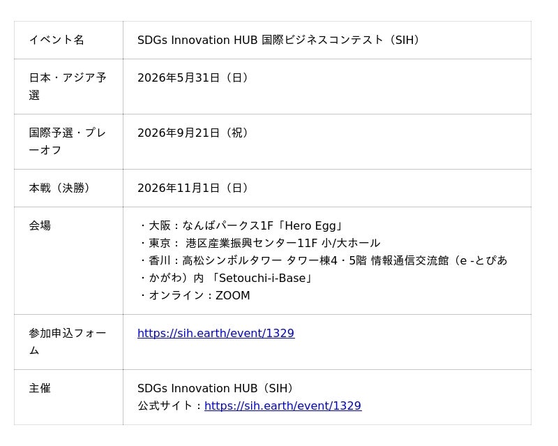 当社が運営する「Hero Egg」は、SDGs達成に向けたビジネスコンテストやイノベーション創出を支援する国際プラットフォーム「SDGs Innovation HUB(SIH)」が主催する、「SIH 国際ビジネス創造コンテスト 2026」の関西拠点として採用されました。