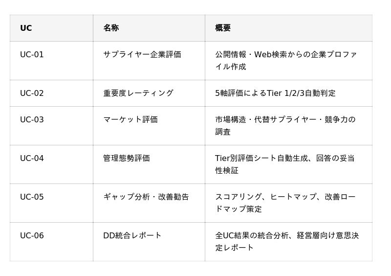 DDプロセスを構成する主要工程(情報収集・スコアリング・評価シート生成・ギャップ分析・レポート作成等)の大部分をAIエージェントが自動実行する設計です。