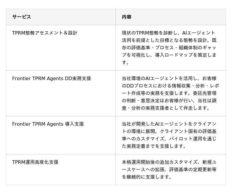 デジタル・ガバナンス領域専門のプロフェッショナルファームであるフロンティア・アドバイザリー・アンド・コンサルティング株式会社(本社:東京都中央区、代表取締役社長:正田 洋平、以下「当社」)は、既存のサードパーティリスク管理(TPRM)コンサルティングサービスを拡充し、AIエージェント技術を活用した委託先デューデリジェンス(DD)自動化サービス『Frontier TPRM Agents』の提供を開始いたします。