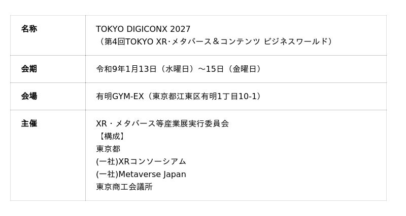 XR・メタバース等産業展実行委員会は、XR、メタバース、AI、Web3、コンテンツ等に関連する都内産業の更なる活性化を図ることを目的として、関連する事業者が一堂に会す「TOKYO DIGICONX(TOKYOXR・メタバース&コンテンツビジネスワールド)」を令和5年度から開催しています。