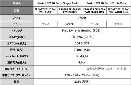 「ProArt PF120 Fan - Single Pack」「ProArt PF120 Fan - Triple Pack」