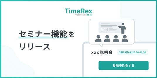 TimeRexはこれまで、個人やチームの日程調整を効率化する多様な機能を提供してまいりました。一方で、セミナーや説明会を主催するユーザーからは「1つの日程に複数ゲストの予約を受け付けたい」という要望に加え、「集客用のページ作成から予約受付、開催後のフォローまでを一気通貫で管理したい」という声を多くいただいておりました。今回リリースした「セミナー機能」により、専用のセミナーページの作成から、リアルタイムの定員管理、開催後のアンケート回収までをTimeRexひとつで完結。イベント運営に関わる一連のフローを自動化し、ワンストップで支援します。