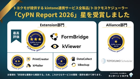 トヨクモ、サイボウズ『CyPN Report 2026』にて全kintone連携サービスおよびトヨクモ スケジューラーが星評価を獲得。FormBridgeとkViewerは最高評価の3つ星受賞