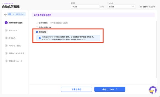 自動応答の設定画面「対象の投稿を選択」ステップにおいて、新たに「次の投稿」が選択できるようになりました。