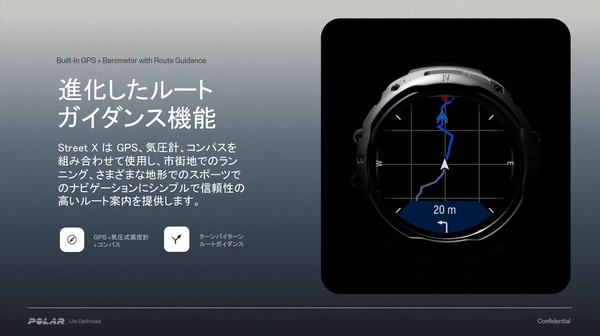 ナビゲーション面では、GPS、コンパス、気圧計を組み合わせたルートガイダンス機能を備える。オフラインマップ(内蔵地図)は非搭載だが、従来モデルより視認性を向上させた。ランニングパワー計測やゾーンロック機能など、パフォーマンス向上に役立つ機能も搭載し、170種類以上のスポーツに対応する。なお、GPSはシングルバンドの採用となった。質疑応答でビル街でのGPS精度について問われた榊原氏は「デュアルバンドにするとコストとバッテリーに影響する。テストではちょっとしたビル群であればシングルでも大きな影響はない」と説明した。