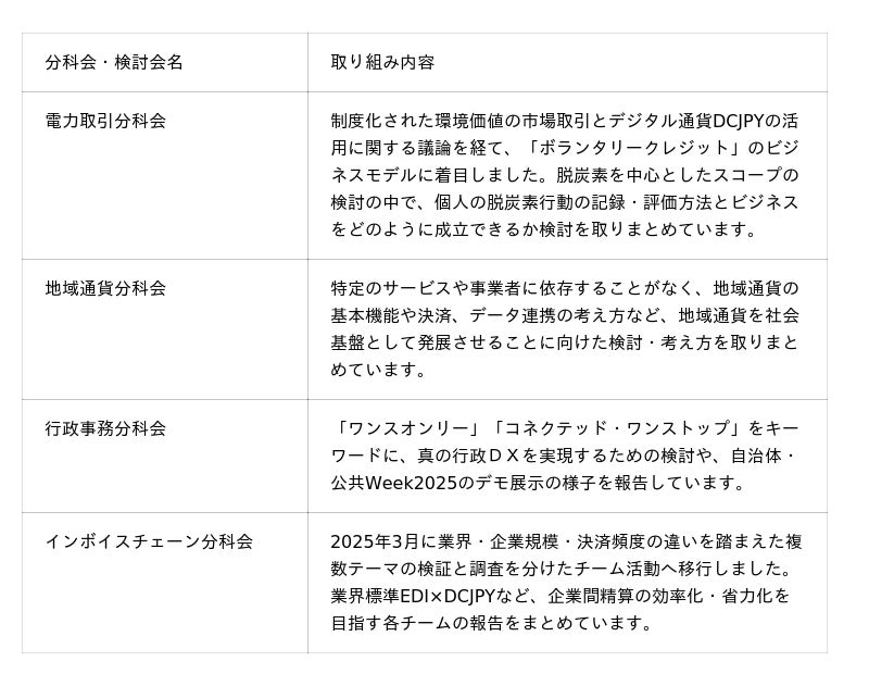 2020年6月にデジタル通貨勉強会で11のメンバーから始まった取り組みは、デジタル通貨フォーラムへと発展し、現在は131のメンバーを含むフォーラムへと拡大しております。本フォーラムでは、新たな参加者や新任担当者を含むメンバーとのユースケースに関する意見交換を目的としたオリエンテーション会やユースケース検討会に加え、新たな領域でのデジタル通貨DCJPYの活用ケースを検討する各種の分科会を設けております。ご関心をお持ちの企業・自治体・団体の皆様からのお問い合わせを歓迎いたします。