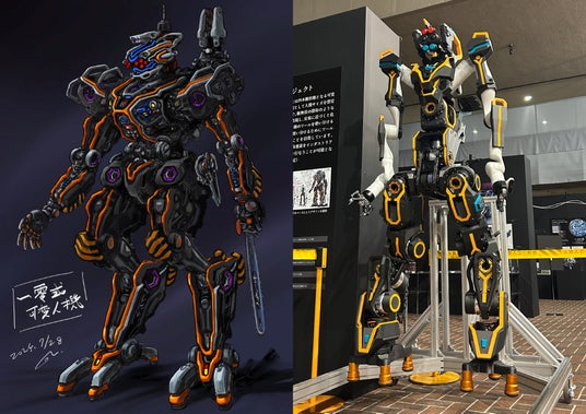 左:河森正治氏による一零式人機コンセプトスケッチ、右:一零式人機 ver.1.0 実機