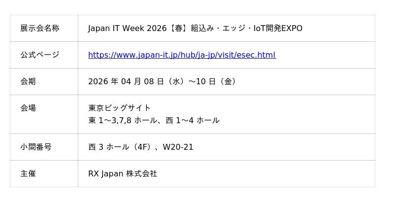 零式人機などの人型重機を開発する株式会社人機一体(本社:滋賀県草津市、代表取締役社長:金岡博士、以下「人機一体社」)と、産業用 PC(IPC)市場で世界シェア 42.5 % を誇るアドバンテック株式会社(本社:東京都台東区、以下「アドバンテック社」)は、制御に関する協業の協議を開始いたしました 。これに伴い、2026 年 04 月 08 日(水)~ 10 日(金)に東京ビッグサイトで開催されるJapan IT Week 2026【春】内の「組込み・エッジ・IoT 開発 EXPO」アドバンテック社ブースにて、人機一体社が開発を進めるロボットの展示を実施いたします。